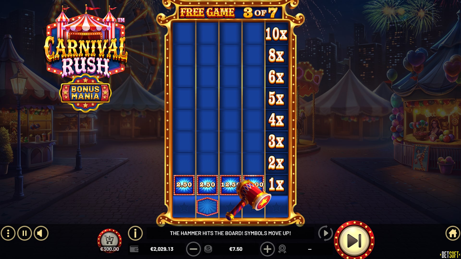 3+ SCATTERS trigger the PICK FEATURE. Choose between FREE SPINS or the CARNIVAL RUSH FEATURE! If you pick the CARNIVAL RUSH FEATURE, you will get 1 FREE SPIN, guaranteed to win 1 of the following features: CASH symbols with values or BONUS PRIZES, a round of PLINKO GAME, or the HI-STRIKE SMASH GAME!