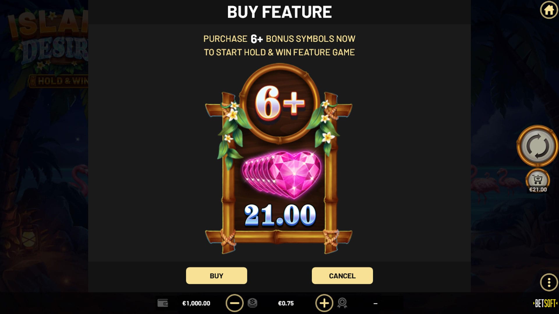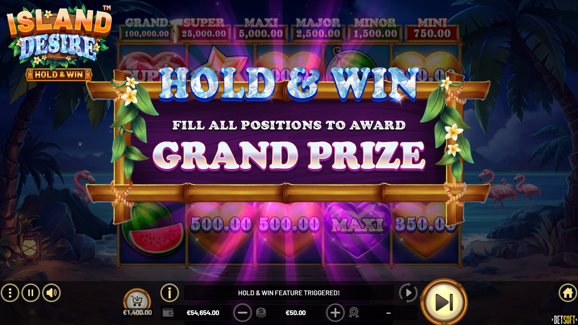 Match symbols hidden among swaying palm leaves and collect BONUS hearts to unlock the exciting HOLD & WIN FEATURE, where big wins and tropical memories await. Relax in your virtual paradise, surrounded by lush beauty and the sweet scents of jasmine and hibiscus.